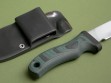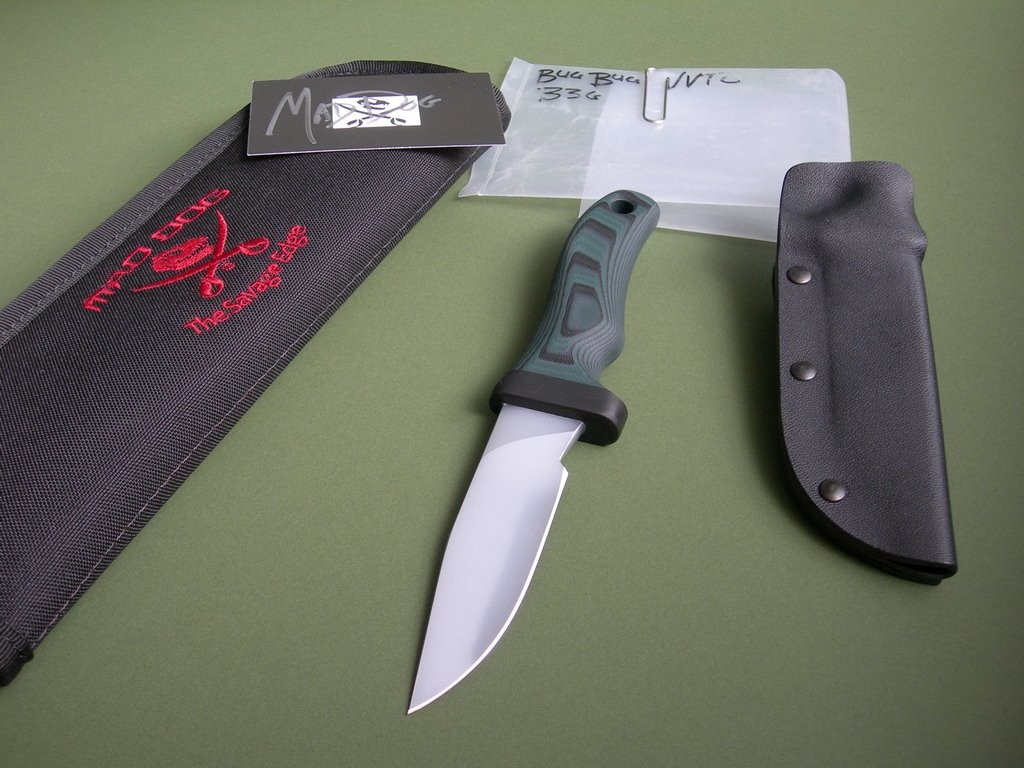 Summary: this is a Mad Dog Knives "Bug Bug" with a 4" hard chromed blade with VVTL finish. (very visible temper line) Blade is perfect -- razor sharp edge with a type 1 choil. The black & green handle material is the proprietary glass / epoxy composite -- compression bonded to the hidden full tang and incredibly ergonomic. 3/16" blade stock – overall length is 8-1/8". Mad Dog trademark on the ricasso – this knife has never been used and is in mint condition.
