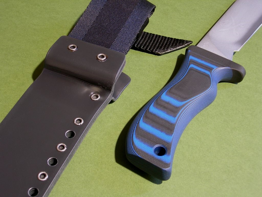 Summary: this is a Mad Dog Knives ATAK , 7" hard chromed blade with Large JMD etching and VVTL finish Razor sharp and extremely versatile, 1/4" blade stock and incredibly durable. The knife was fitted with the new black and blue composite handle, overall length is 12". Mad Dog trademark on the blade – the knife is brand new and in mint condition.