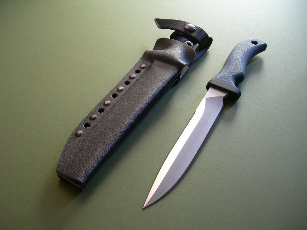 Summary: a Mad Dog Knives “Shrike” with a double-edged 7" blade, VVTL finish and super small JMD blade etching. Upper edge fully sharpened – it's very fast in hand and extremely versatile. The black and blue handle material is the proprietary glass / epoxy composite -- compression bonded to the hidden full tang and incredibly ergonomic. 1/4" blade stock with the optional type 3 choil – overall length is 12". Mad Dog trademark on the blade, this knife is brand new and in mint condition.