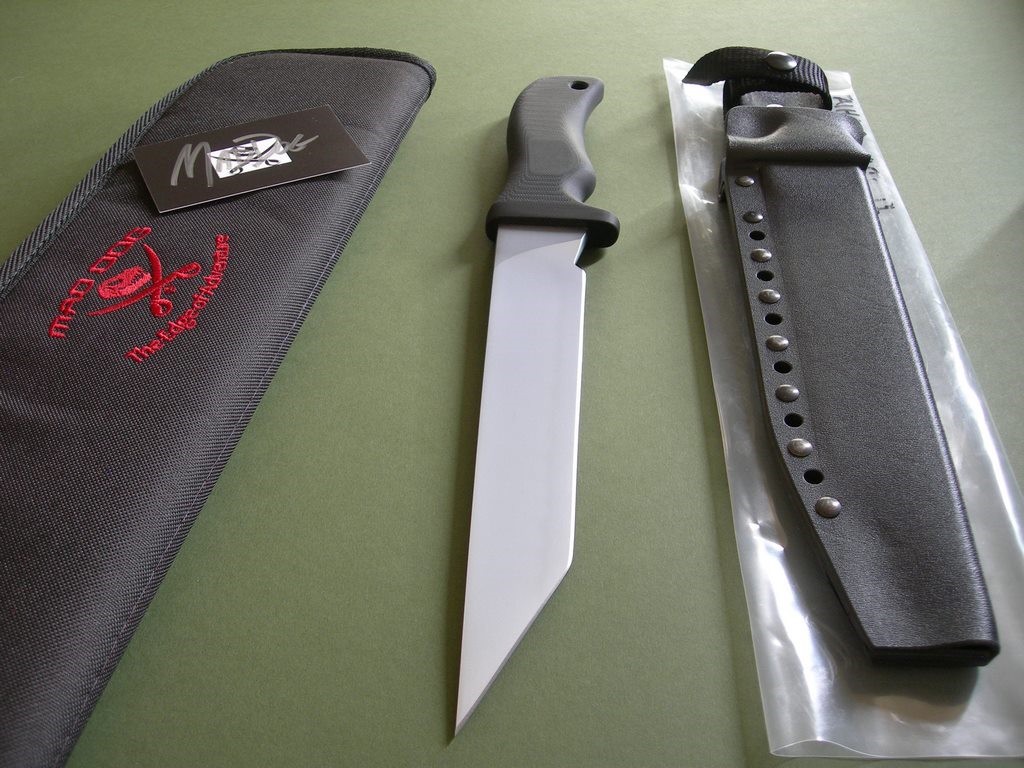 Mad Dog "Taiho 9" with a 9" hard chromed tanto blade and upgraded VVTL finish. One with large JMD and one with MDJMD, both made with T1 choils and black composite handles. This is a heavy hitting tactical fighter, 1/4" blade stock with an overall length of 14-1/8". I haven't seen another Taiho 9 for sale in like... FOREVER!! (other than my website!) These bad boys are brand new and in mint condition.
