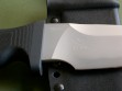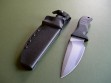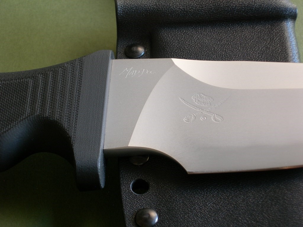Summary: this is a Mad Dog Knives "Voodoo Frog" with a 6" hard chromed, double-edged blade that has the VVTL finish. Blade is perfect -- razor sharp edges with a type 3 choil. The black composite handle material is compression bonded to the hidden full tang and incredibly ergonomic. 1/4" blade stock – overall length is 11". (6” blade with big handle… it’s a Voodoo Frog on steroids! Typically the VF’s measure in at 10-1/2” OAL) Mad Dog trademark on the ricasso, small JMD on the back side blade. Mint condition, good to have a black handled Voodoo Frog back in stock!
