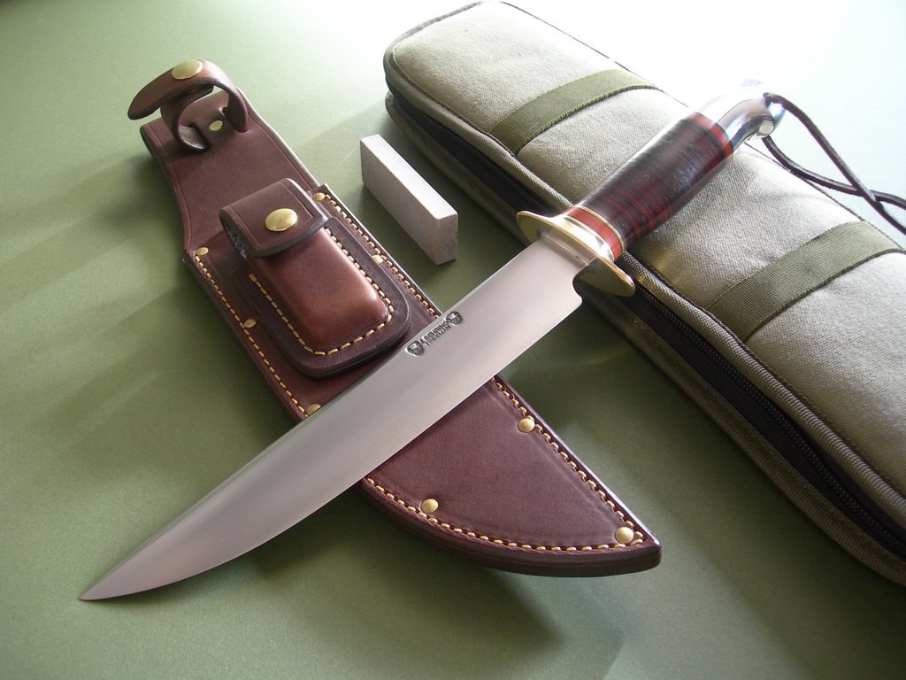 The custom riveted stone pocket sheath is a thing of beauty and has the thigh lanyard loop on the back. Large white sharpening stone in the front pouch, good fit and doesn’t rattle around. The sheath in mint condition, Treeman Leather Shop stamp on the back.